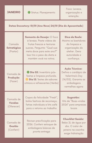 É um calendário estratégico anual criado para confeiteiras que querem saber exatamente o que fazer em cada mês do ano para vender mais, sem precisar pensar em marketing.